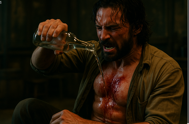 피 흘리는 상처 위로 술을 붓는 장면은 시각적으로 강렬합니다.